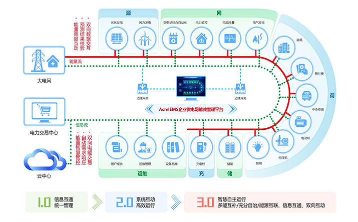 簡介:1.概述 通過在源、網、荷、儲、充的各個關鍵節(jié)點安裝監(jiān)測、分析、保護、治理裝置, 通過高性能邊緣計算網關采集數據并上傳至企業(yè)微網平臺。平臺根據新的電網價格、 用電負荷、電網調度指令等情況,調整各系統控制策略并遠程下發(fā),使企業(yè)微電網始終高效穩(wěn)定運行, 降低企業(yè)用電成本,實現能源互聯、信息互動。 2.應用場所 適用于各行業(yè)企業(yè)內部微電網管理系統的新建、擴建、改建等項目。 3.平臺結構 3.平臺功能 安科瑞AcrelEMS企業(yè)微電網能效管理平臺融合了電力監(jiān)控、電氣安全、照明控制、能源管控、充電樁運營管理、分布式光伏監(jiān)測、儲能管理、設備臺賬、運維管理等功能,通過一個平臺、一個APP整體的對企業(yè)用電進行集中監(jiān)控、統一調度、統一運維,并且根據當地供電部門錯峰避峰計劃提前為企業(yè)制定錯峰避峰方案和預警,滿足企業(yè)